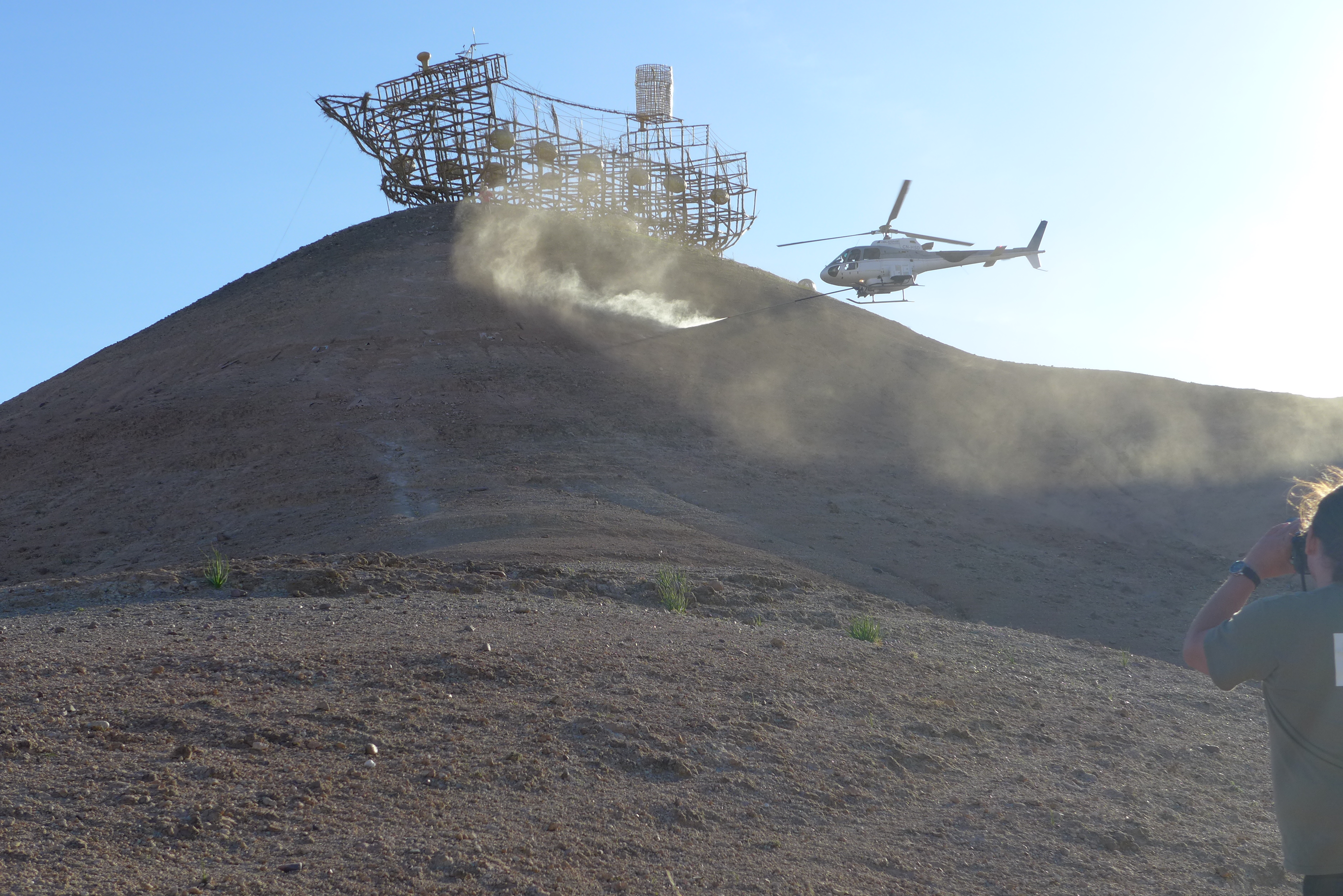 Doch wider diese phänomenale Elevation in erhabener Kulisse musste nun ein Helikopter aufsteigen, der, als wäre es der erektilen Setzungen nicht genug, mit einem langen Rohr an der Front eine Inschrift aus dem Wüstensand blies, die italienisch hieß: „Vada a bordo, cazzo“, was so viel heißt wie „Geh an Bord, S…“. Auch wenn dies die letzten Worte der Küstenwache an den glücklos-dummen Costa-Concordia-Kapitän gewesen sein mögen, man wollte diesen infantilen Imperativ hier nicht sehen, zumal er als Appell an das Publikum gerichtet war. So beeindruckend das Schiff in der Landschaft, so degoutant seine Botschaft.