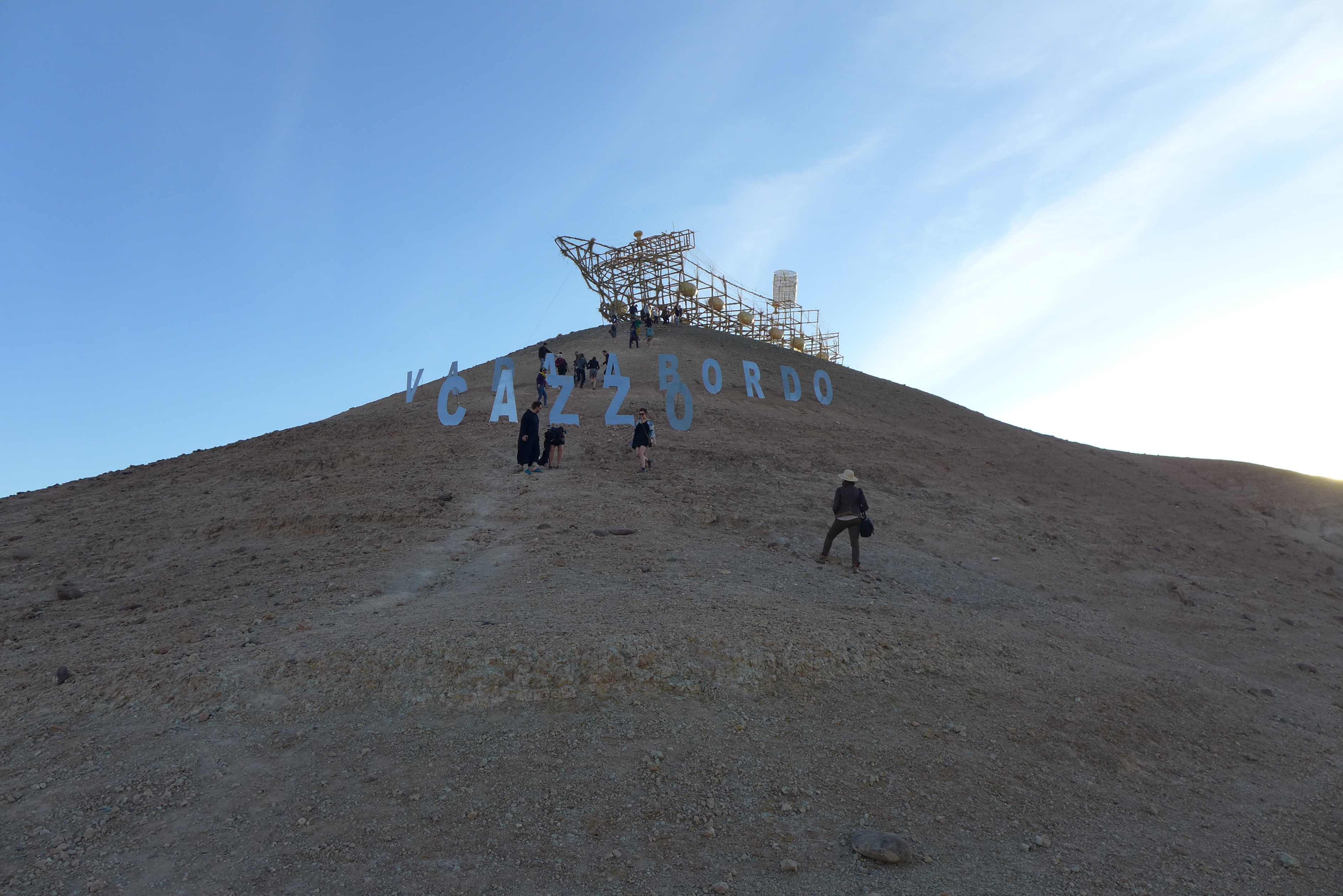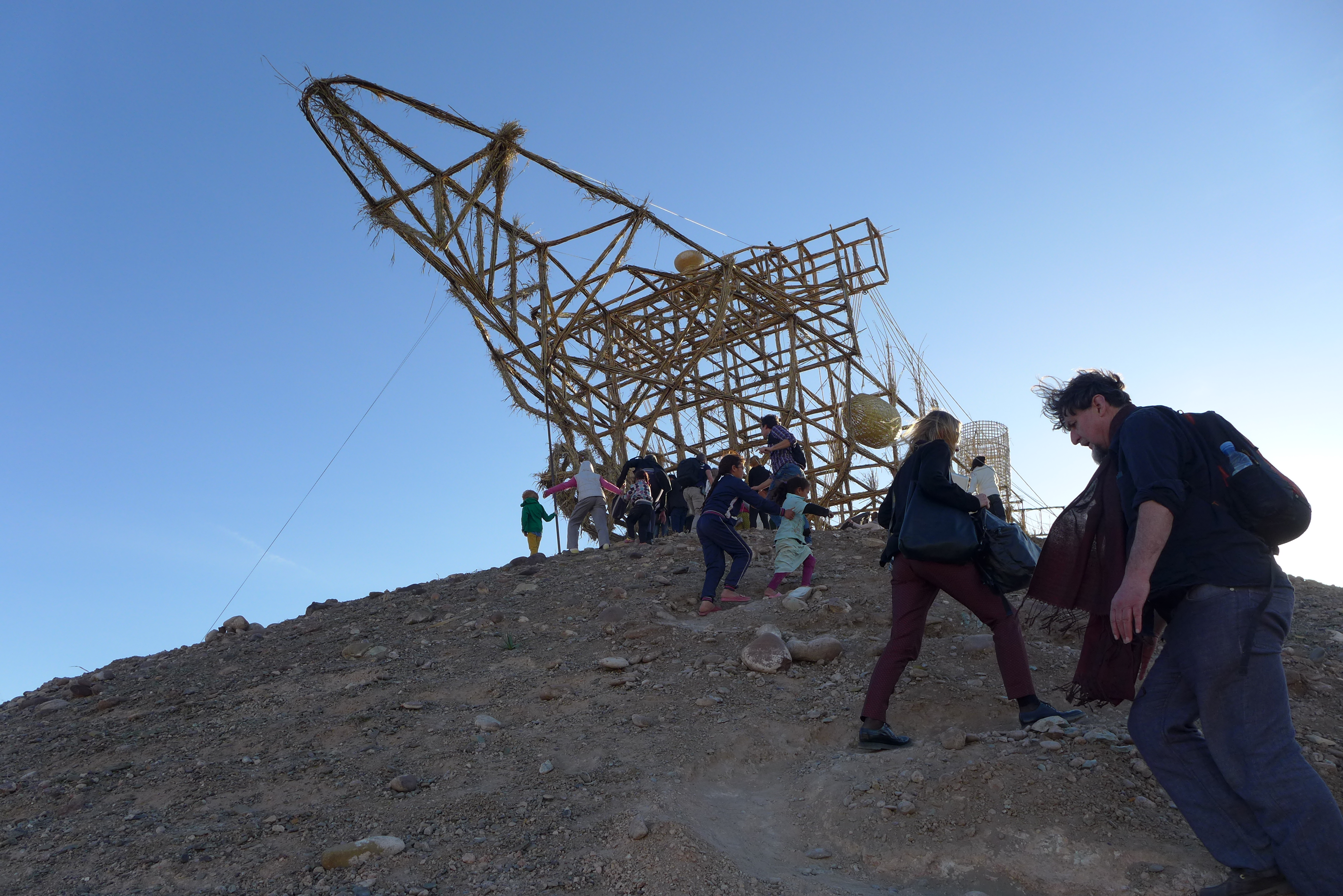 Schon seit Wochen hatte der russische Künster Alexander Ponomarev seine mit Bambus verkleidete Stahlskelett-Arche gefährlich equilibriert in den Wüstensand bauen lassen. Das Wasserfahrzeug entpuppte sich bei näherem Besehen nicht etwa als die von Jeremy Deller zur Venedig Biennale symbolisch versenkte Jacht „Eclipse“ des Oligarchen Roman Abramovich, sondern als die etwas geschrumpfte „Costa Concordia“.