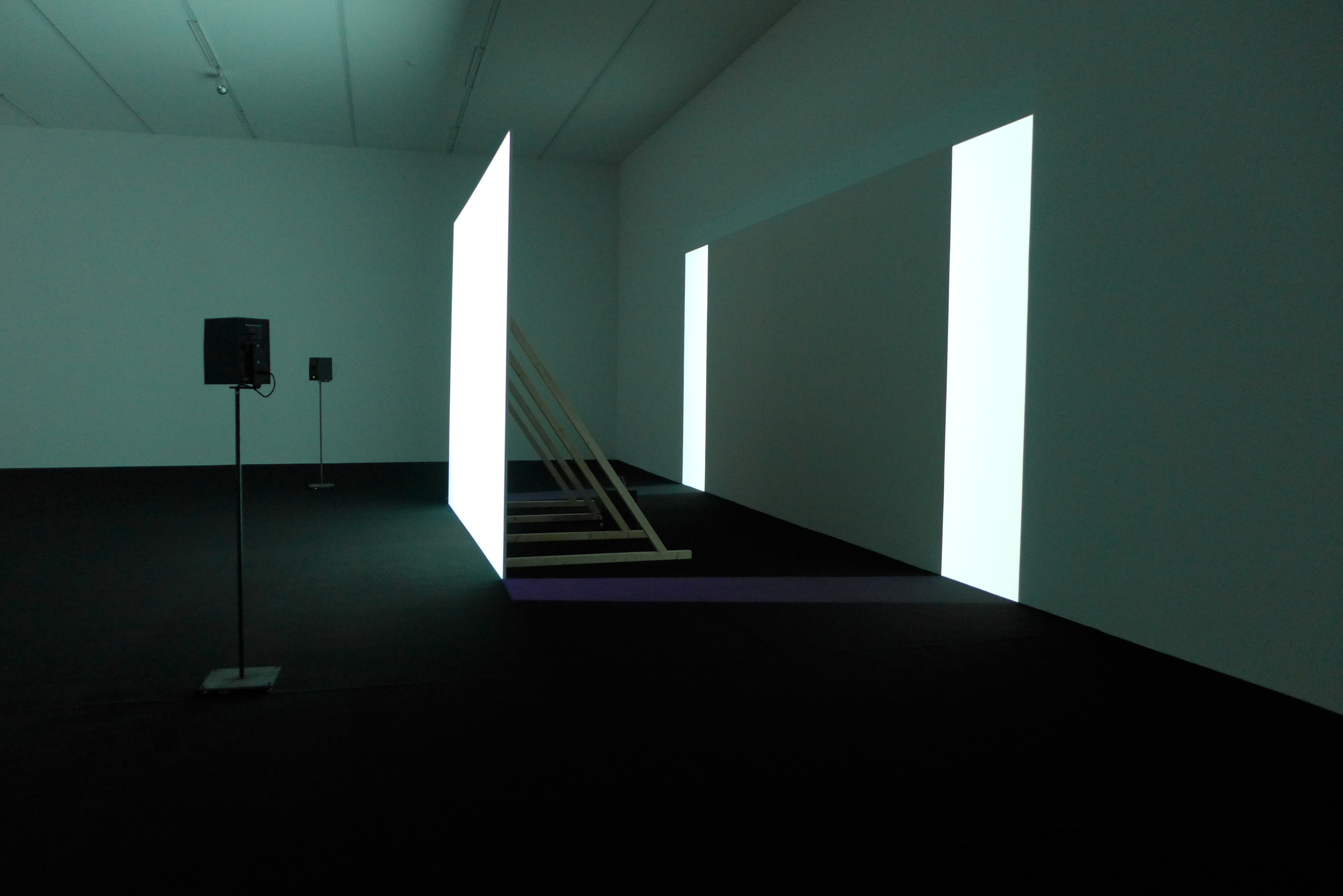 Eine missglückte Entscheidung dann auch im selben Raum, Fußnoten gleich, die drei Videos „Warm, Warm, Warm Spring Mouths“ (2013), „Even Pricks“ (2013) und „Material Witness or A Liquid Cop“ (2012) zu präsentieren. Wer wollte die zehn bis zwanzig Minuten langen Arbeiten in gebotener Gänze im Stehen und über Kopfhörer genießen? Ihre penetrante Wucht nahm der Besucher zur Kenntnis, bevor er in den angrenzenden Saal mit der zwei-Kanal-HD-Videocollage „Us Dead Talk Love“ (2012) überwechselte, in der der rumpflose Avatar auf zwei in den Raum gestellte Projektionswände über Liebe, Tod und Körper und ein Haar an der Vorhaut als Referenz an das Reale räsonierte. Immerhin konnte man hier sitzen.