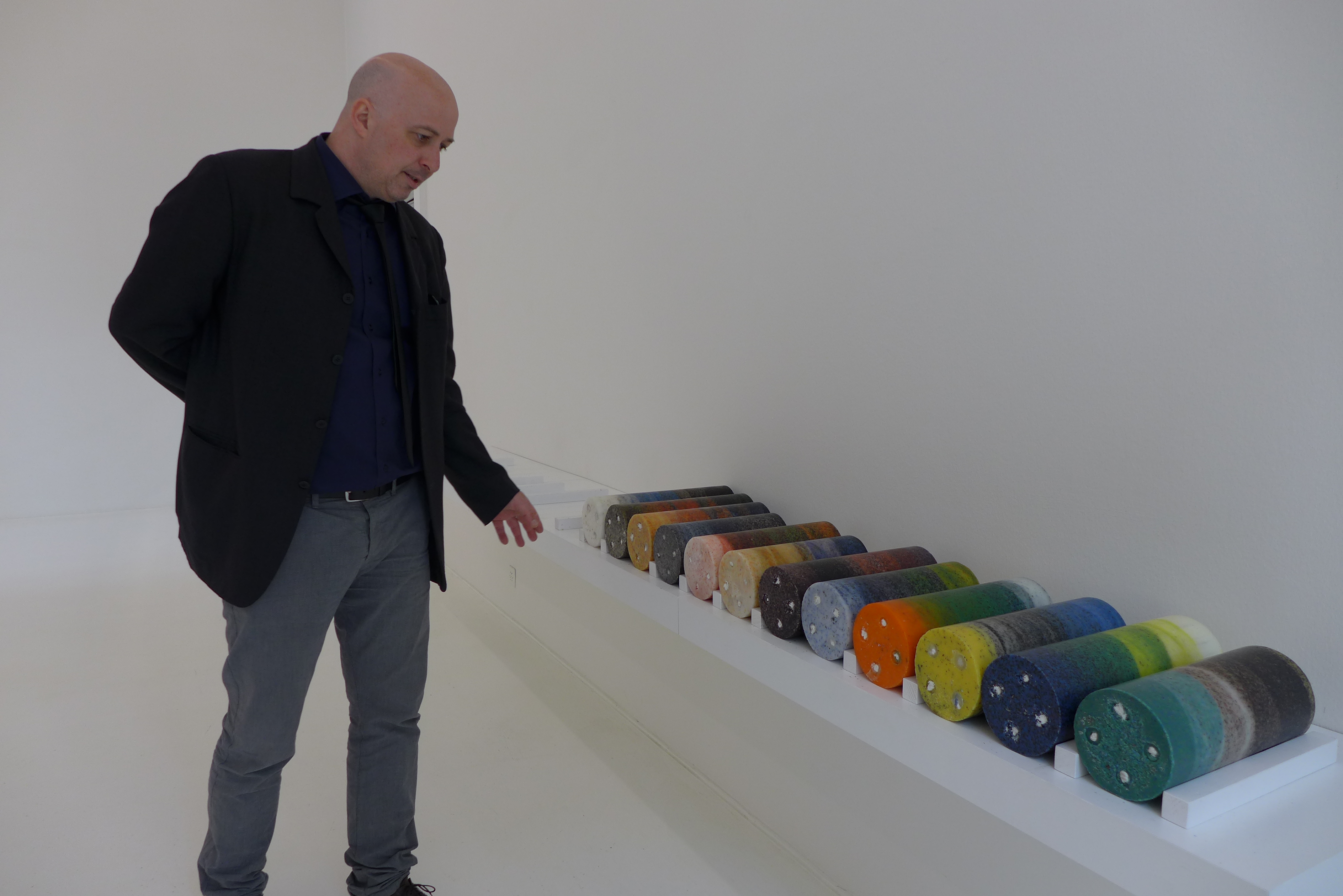 Schon der erste Raum sorgte für Irritation. War das Atelier oder Alchemistenküche? Auf einem weißen Tisch an der Wand lag eine Batterie bunter, wuchtiger Wachkerzen, die der Künstler eigens für seine „RPPM (Random Planet Production Machine)“ (2013) entwickelt hatte. Diese stand gut zwei Meter hoch mitten im Saal. Eine brennende Kerze im oberen Teil der regalartigen Apparatur sonderte über einen beheizten Trichter Wachs ab, das auf eine rotierende Stange nach unten tropfte. Obwohl beziehungsweise, weil die Rotationen der Stange zufallsgesteuert waren, bildete sich dort mit der Zeit eine Kugel.