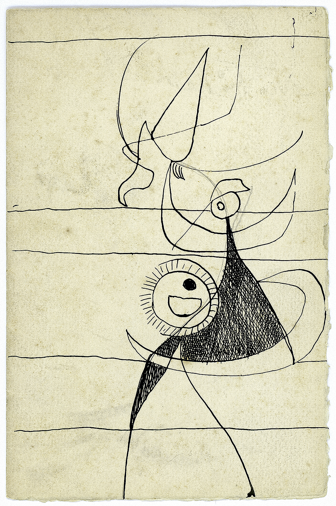 Hält Debrunners Malerei den Vergleich nicht aus? Mag sein. Die Ausstellung verzichtet ganz darauf, wohl auch, um die Qualität ihrer grafischen Arbeiten hervorzuheben. Sie hat erst mit Anfang zwanzig zur bildenden Kunst gefunden. Ihr Schaffen, von familiären Verpflichtungen, Krankheit und Selbstzweifeln unterbrochen, kannte nur zwei wirklich produktive Phasen: In den 1940er-Jahren, als Mitglied der progressiven schweizerischen Künstlergemeinschaft „allianz“, an deren Ausstellungen sie sich von 1947 bis zu deren Auflösung 1954 regelmäßig beteiligte, und in den frühen 1970er-Jahren, nachdem sie sich im Aargauer Biberstein niedergelassen hatte. Im vierten Saal gelingt dann die Paarung mit sieben kraftvoll wilden Gouachen des Künstlers, Musikers und hospitalisierten Psychopathen Louis Soutter aus den 1930er-Jahren. Soutters schattenrissartige Personnagen sind hier unter anderem Debrunners „Entfaltung auf der Grenze“ (1949) gegenübergestellt, das kleiner im Format, und mit Tusche und Deckweiß, statt Ausrissen, mit einem verspielt-kringelnden Faden die Collage aus dem Jahr 1968 vom Eingang antizipiert. An der gleichen Wand nehmen sechs 50 x 30 cm große Querformate, Tuschzeichnungen mit schwarzem Filzstift den Takt wieder auf. „Rücklings“ (1972) und die fünf Arbeiten „Ohne Titel, Blindzeichnungen“, zwischen 1974 und 1976 entstanden, folgen wie durch den Faden aleatorisch gesetzten Linien und Flächen, die nachträglich durch expressive Schraffuren zur Geltung und Bedeutung gebracht werden, Gefühlslandschaften, Seelenkartografien. Wie Silvia Bächli mit ihren zarten Tuschzeichnungen aus den 1980er-Jahren zwei Räume weiter ein direktes Echo auf Louis Soutters zeichnerisches Werk zurückgibt, stehen Gertrud Debrunners stärksten Arbeiten aus den 1940er-Jahren im Echoraum Paul Klees. Von ihm zeigte die Kunsthalle Bern 1935 eine Retrospektive, 1940 das Kunsthaus Zürich eine Jubiläumsausstellung. Es ist wahrscheinlich, dass Debrunner diese Ausstellungen gesehen hat. Doch so nah ihre bezaubernde Tuschezeichnung „Ohne Titel, Skizze zum Traumbild Transzendenz“ (1946) auch an Klees Bilderwelt angesiedelt ist, besticht sie durch ihre sichere Hand und Anmut. Ihre Arbeiten halten auch den direkten Vergleich mit dem Klassiker der Moderne nicht nur mühelos aus, sondern geben diesem neuen Glanz zurück, wie es die beiden Collagen „Ohne Titel“ 1964, mit einem elektrisierenden Tuschekrakelee, zeigen, wenn sie Klees „Garten im November“ (1929) oder „Wochenende im Wasser“ (1935) gegenüberstehen.