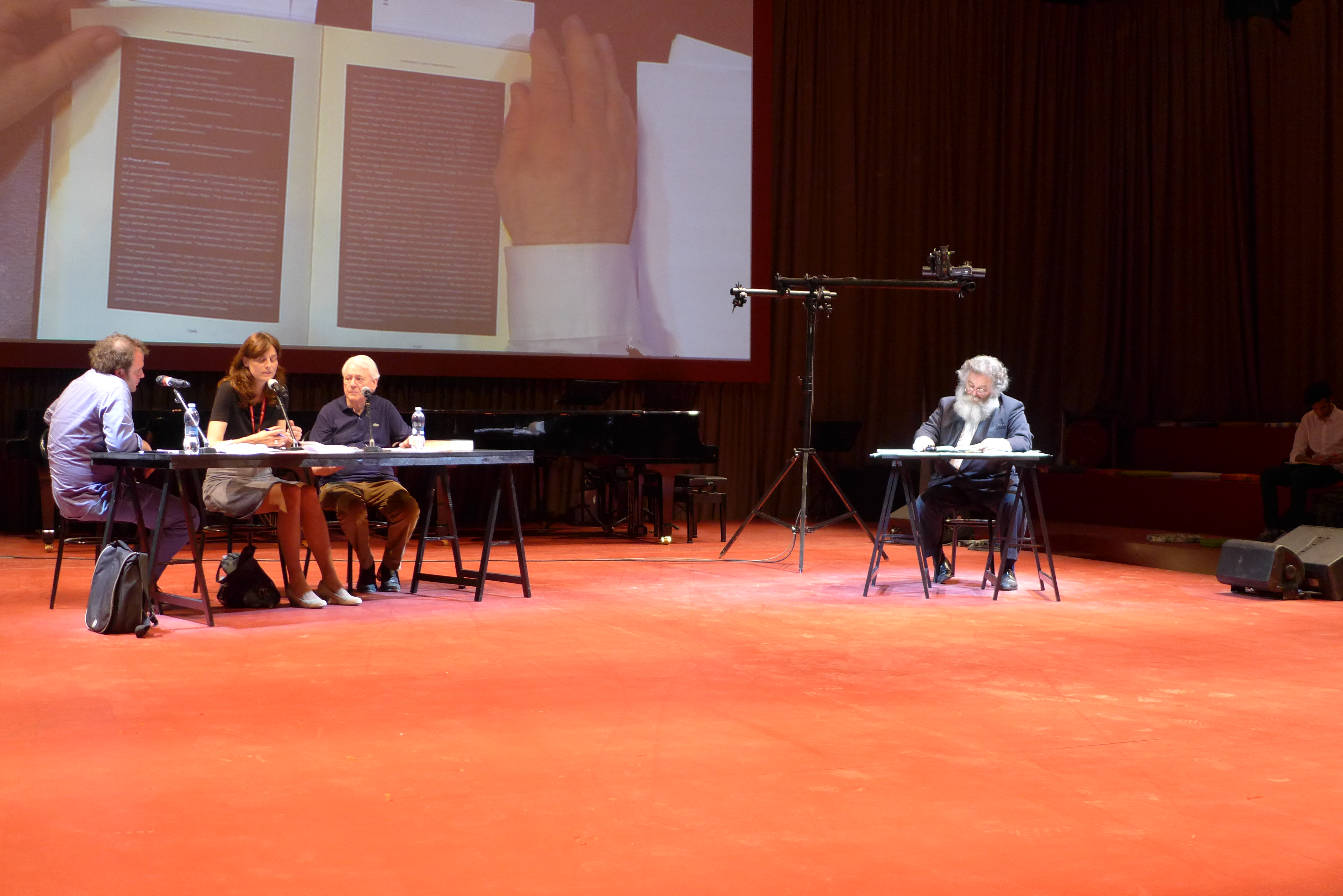 Bereits am zweiten Tag hat sich Alexander Kluge auf die Bühne gewagt. Von einer Philosophin und einem Philosophen rechts am Tisch sekundiert doziert er auf Englisch eine knappe Stunde lang über seine Marxlektüre. Für den optischen Gimmick sorgt ein veritables Karl-Marx-Double, das Texte in den Videobeamer halten oder schreiben darf. Wie sein Kollege Isaac Julien („KAPITAL“, 2013) zeigt auch er nebenan eine Videoarbeit, „Nachrichten aus der ideologischen Antike“ (2008-2015), der man, wie seinem Vortrag in der Arena, durch die synästhetischen Überlagerungen nur ungern folgen möchte.