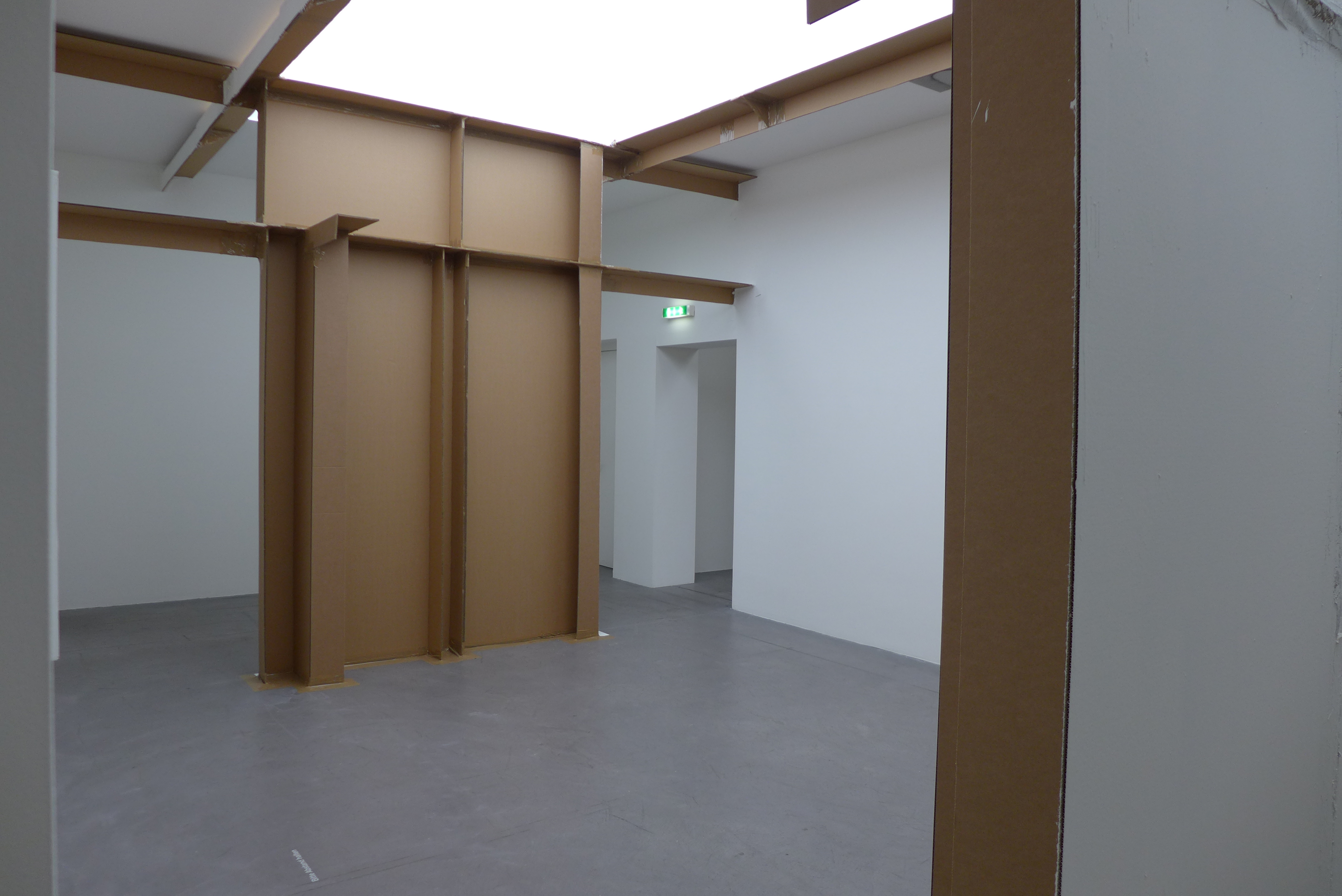 Zunächst fällt dem Besucher die Dialogizität der ephemeren Kartonkonstruktion mit der Stahlträgerarchitektur kaum auf und überträgt sich in ein stimmiges Gefühl von Proportion im Nacheinander der Raumfolge. Doch bei näherem Besehen wird deutlich, dass die Pappe nicht nur das Profil der Stahlstützen und Deckenträger wiederholt, sondern jede Wand in Form und Maß auf die vorhandene Situation reagiert. Ihre Breite entspricht genau den Oberlichtfenstern, die auch die Abstände der Wände im Raum zueinander definieren. Vertikale Pappkonstruktionen unter der Decke und über den Durchgängen, führen scheinbar von einem in den anderen Raum, und vermitteln den Eindruck, dass der massive White Cube nur durch die verbindende Statik des Einbaus gehalten wird.