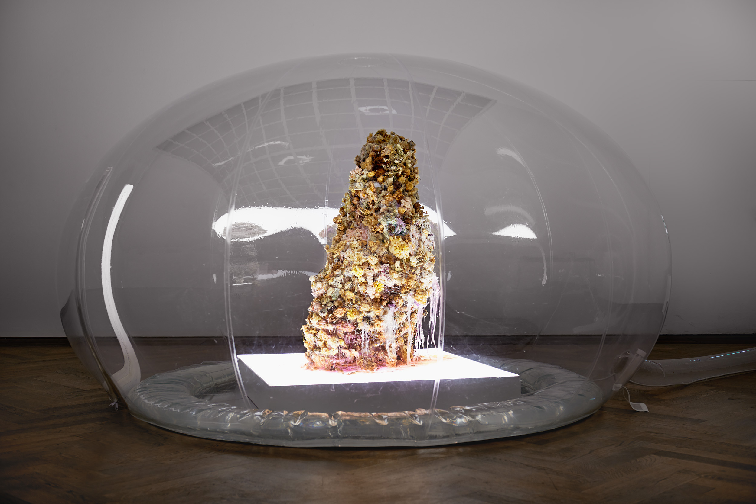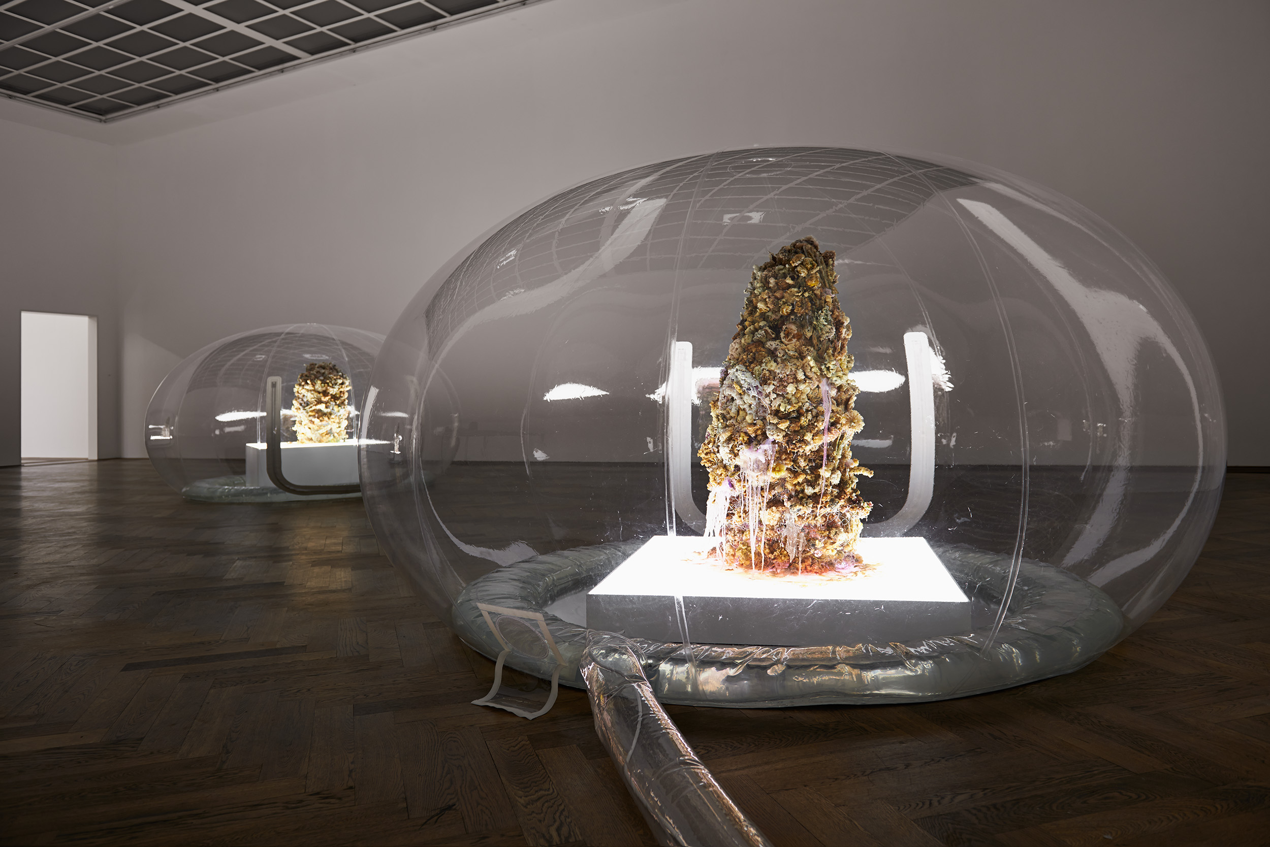 Bis dahin hat der Besucher Anicka Yis Ausstellung „7.070.430K of Digital Spit“ schon einiges hinter sich. Ihm wurde glibberiges grünes Gel in Plexiglaskisten präsentiert („Shameplex“, 2015), Seifenobjekte (u.a. „Lung Condom“ 2015) und wuchernde Bakterienkulturen (u.a. „Embassy Row“, 2015), Geruchsproben aus Wäschetrommeln („The Last Diamond“, 2015) oder Kunstlederfetzen, die wie verbannte Haut über Chromgestänge drapiert wurden („Middle Earth Medical“, 2015). Hin und her gerissen von der zweifellosen Schönheit der Objekte, die doch im Kern als Abjekte zu bezeichnen sind, abstoßende, weil vergänglich- ungreifbare Wucherungen, Auswürfe der Natur, die sich der Gestaltung eigentlich entziehen. Dass sie dennoch in die Kunst Einzug halten können, hat bereits Eva Hesse mit vergänglichen Latexobjekten, Joseph Beuys mit Fettecken vorexerziert und Dieter Roth mit Schimmelbildern und Verfallsmonstranzen weiter kultiviert. Doch der Zauber der drei Arbeiten, ihre Anziehung und Abstoßung übertrifft alles bisher Gesehene, das nunmehr im Crescendo zu einem triumphalen Finale präludiert. Das penetrante Geräusch tritt rasch in den Hintergrund und legt sich wie eine akustische Schutzhülle um die Plastikblasen, die sich als Teil der skulpturalen Setzung wiederum schützend um die Sockel blähen, die die drei amorphen Figuren tragen und als einzige Lichtquelle im Saal von unten geheimnisvoll beleuchten. Die Figuren sind bei näherem Besehen aus Wachs und an einem Drahtgestell befestigte, im Teigmantel frittierte Blumen, deren reizend blass-bunte Farben in einem krassen Gegensatz zu ihrer abstoßend schrundigen Oberfläche steht, die sich in den Plastikblasen verwunschen spiegeln.