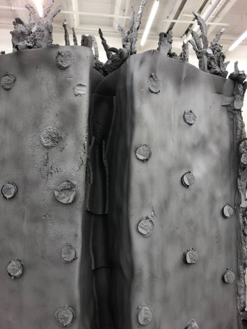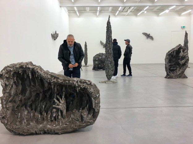 Das macht sich der junge bretonische Künstler nun zunutze und lotet die Möglichkeiten des in der Kunst selten genutzten Guss-Aluminiums aus. Sieht der Besucher im ersten Galerieraum rurale Motive, Maiskolben als aufrecht stehende Bilder eines phallisch konnotierten Überflusses, zum Beispiel in Crossing the parallel worlds (alle Arbeiten 2018), folgen im zweiten White Cube morbide Miniaturlandschaften, Höhlen in hüfthohen Halbkugeln (u.a. The cave of time [mystique]), aufrecht stehende Zypressen (u.a. Cypress [blade]), die an Arnold Böcklins berühmte Toteninsel, 1880 erinnern, sowie statt der Heuschrecken (u.a. Invasion), lebensgroße Fledermäuse (u.a. Chiroptera), an denen wie in den Innenseiten der bizarren Halbkugeln deutlich die Eindrücke der knetenden Künstlerhand zu sehen sind. Alle Arbeiten entstanden im Aluminiumguss zumeist in verlorenen Formen. Dabei geht es dem Künstler neben der Ausgestaltung seiner bizarren Form-Welten vor allem auch um die Vielfalt der verschiedenen Strukturen und Oberflächen eines höchst eigenwilligen und künstlerisch anspruchsvollen Werkstoffs. Der Betrachter folgt im darin angeregt und fasziniert. Ein formal forderndes und auch einzigartiges Erlebnis.