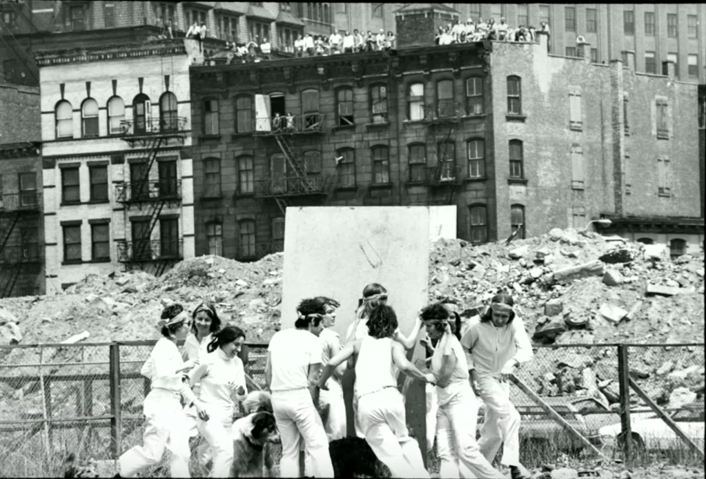 For this work, the artist positioned her audience on the roofs of houses in the New York cityscape instead of on cliffs. The thirteen performers were dressed in white, wearing orange-red headbands, and moved between rows of houses and the Hudson River, analogous to the Canadian beach in a ruined no man’s land.