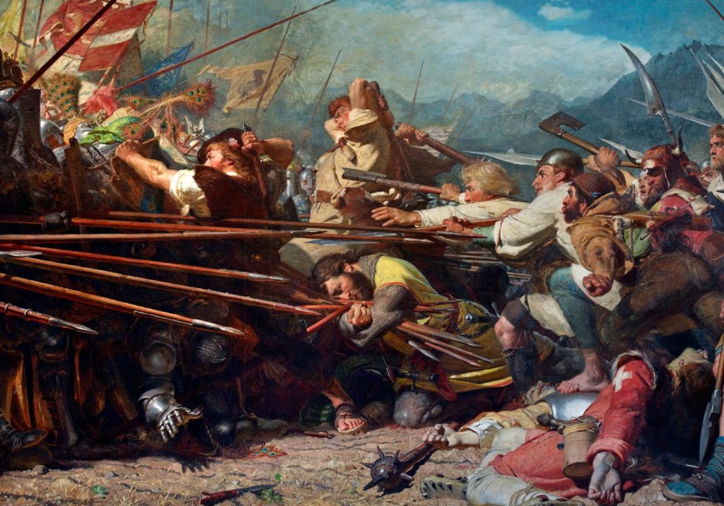 Im Widerspruch zur egalitären Devise etablierte sich als deren sichtbarer Niederschlag die Geschichte des Arnold Winkelried. Der Legende nach soll er 1386 in der Schlacht von Sempach gegen die Habsburger Herzöge die entscheidende Wende herbeigeführt haben, indem er sich mit dem Ruf, „ich will euch eine Gasse machen“ in die gegnerischen Lanzen warf. Der rhetorisch-performative Bogen schliesst sich mit dem Apell an das überlebende Gemeinwesen: „Sorget für mein Weib und Kinder.“