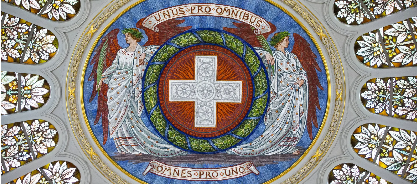 Um 1874 etabliert sich in der Schweiz ein nationaler Wahlspruch, der für die religiös-kulturellen und sozialpolitischen Spannungen des jungen Bundesstaates den nötigen Kit beisteuerte, „Einer für alle. Alle für einen.“ Damit er auch in den romanisch-sprachigen Kantonen funktionierte, ist er auf Flugblättern, Publikationen, Festdekorationen und auch in der verglasten Kuppel des Berner Bundeshauses auf Latein zu lesen: „Unus pro omnibus, omnes pro uno.“