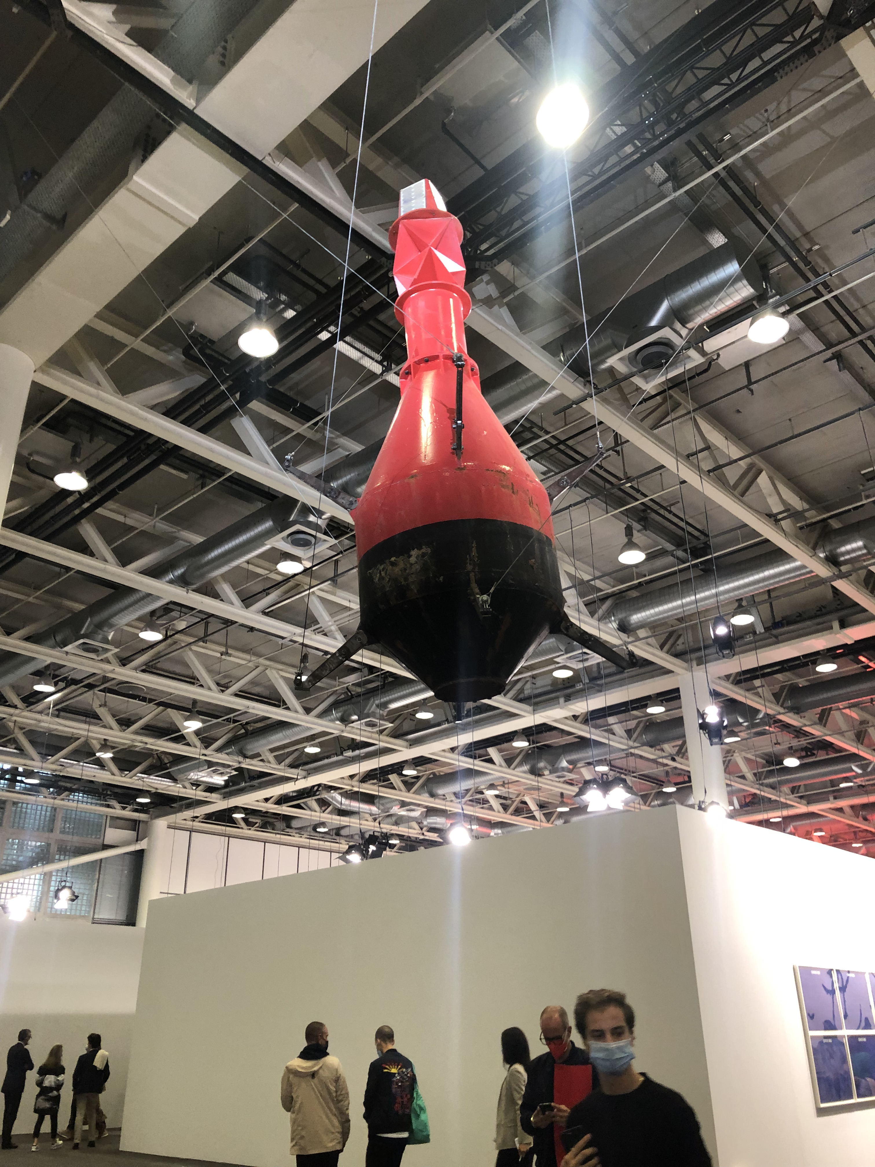 Bedrohlich schwebt das Ding unter der Hallendecke der Art-Unlimited. Es trudelt, taumelt, stürzt. Eine Bombe? Eine „Little Boy“, die wenn nicht zur endgültigen Vernichtung der Menschheit, so doch der Unlimited-Besucherinnen und Besucher am exklusiven Eröffnungstag der Art Basel ansetzt? Bevor die Fantasie Raum greift, tanzt die rot-schwarze Stahlwanne mit Türmchen von Geisterhand nach oben und entpuppt sich als Boje, die irgendwo einen Schifffahrtsweg markierte und nun von Theaterstrippen gezogen, in der Messehalle 1 am Rheinknie stürmische See simuliert. Die Mimik der Tethys (2018/2019) ist eine Arbeit des Konzeptkünstlers Julius von Bismarck, Jahrgang 1983, die auch eine höhnische Grimasse zu Untiefen, Unsicherheit, Unberechenbarkeit, kurz, der Volatilität des Kunstbetriebs reißt.