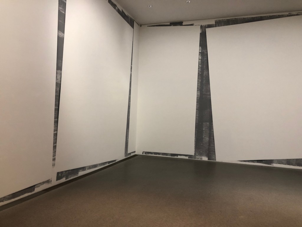 Mit diesem Repertoire im Köcher hält Feldmann Beckmann souverän auf Distanz. Und schon der erste Saal, ein Tabula rasa sondergleichen, ist Verweigerung mit Kampfansage, ein Spiel mit Auge und Verstand. Die acht weissen Flächen sind in den Seiten verzogen und aus dem Lot gekippt und führen durch diesen malerischen Trick ein performatives Eigenleben. Doch sie sind nicht wie es scheint, auf einen grauen Hintergrund getüncht, sondern die nackte Wand selbst, ihre grauen Schatten-Ränder mit Dispersionsfarbe und Rollpinsel erzeugte Trompe d’Œiles, Kunststücke der Augentäuschung.