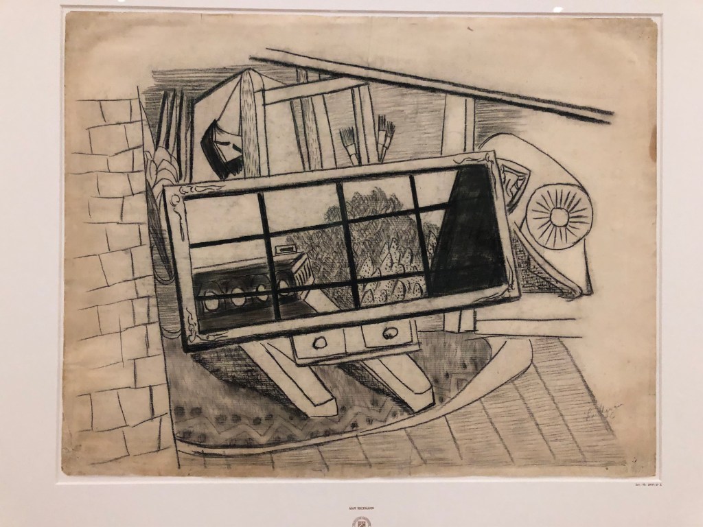 Am Ende des Korridors reisst der Raum auf und die Besucherin, der Besucher steht in einem hohen Saal mit sakraler Anmutung. Die Wände, strukturiert durch grosse, grau abgesetzte weisse Flächen beginnen mit einfachsten malerischen Mitteln zu tanzen. Dahinter schliesst sich ein weiterer, etwas kleinerer Saal an, an dessen Stirnwand eine monumentale scherenschnittartig-abstrakte, monochrome Figur sich türmt und spreizt, auseinanderzufallen droht und doch in einem labilen Gleichgewicht gehalten wird. Eine frühe Tuschzeichnung Beckmanns, ein Selbstportrait 1902, findet sich verloren im ersten Saal, im zweiten dominanter, eine Kreidezeichnung Spiegel auf einer Staffelei aus dem Jahr1926. Das war’s. Doch mit der Inventarliste ist wenig gesagt.