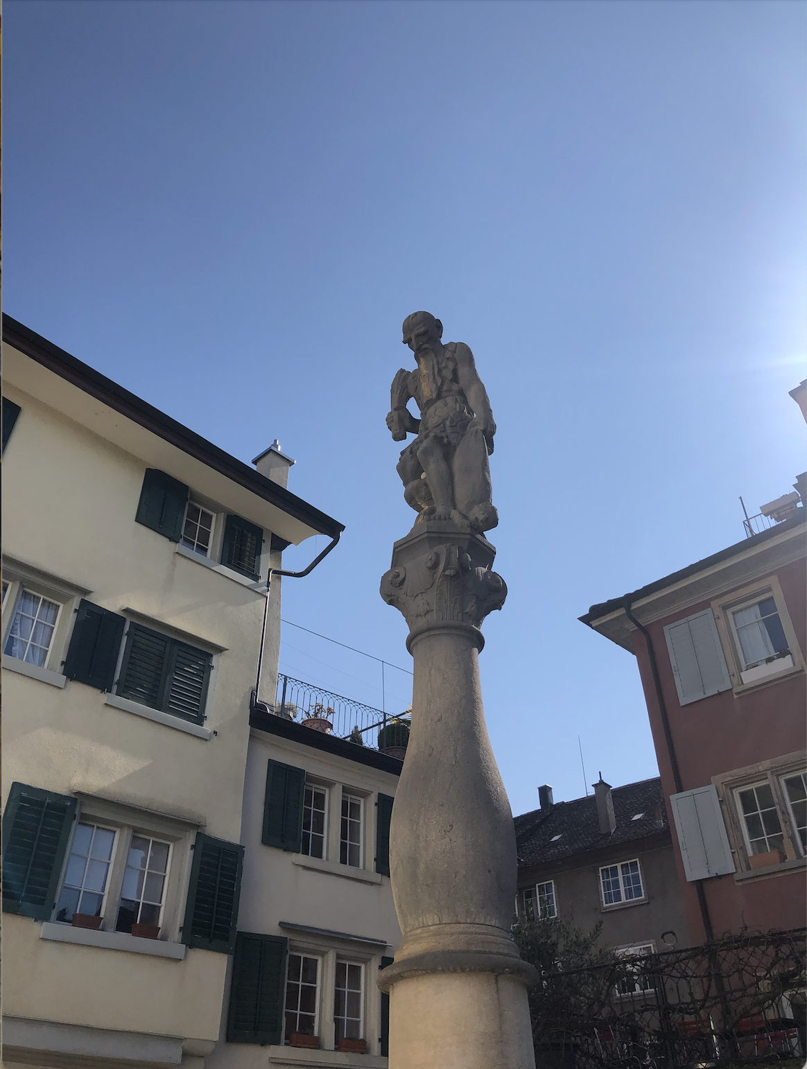 Wir sprechen von einem einnehmenden Plätzchen, das mittendrin an der Neustadtgasse gelegen, mit einem Brunnen zum Verweilen einlädt. Aus dem plätschernden Geviert ragt eine Säule in den blauen Himmel, auf der eine undeutlich sich gegen das Himmelblau und seine Sonne sich abzeichnende Gestalt, eine Figurengruppe bei angestrengtem Fixieren sich abzeichnet: Eine gebeugte koboldhafte Figur mit Bart in wilder Fellbekleidung schwingt mit der rechten Hand einen herkulischen Knüppel auf das Hinterteil einer kleinen, nackten unter dem Peiniger bitter schreienden Gestalt, während die Linke des Peinigers einen Sack wie zur endgültigen Liquidierung seines Opfers in der Hand hält.