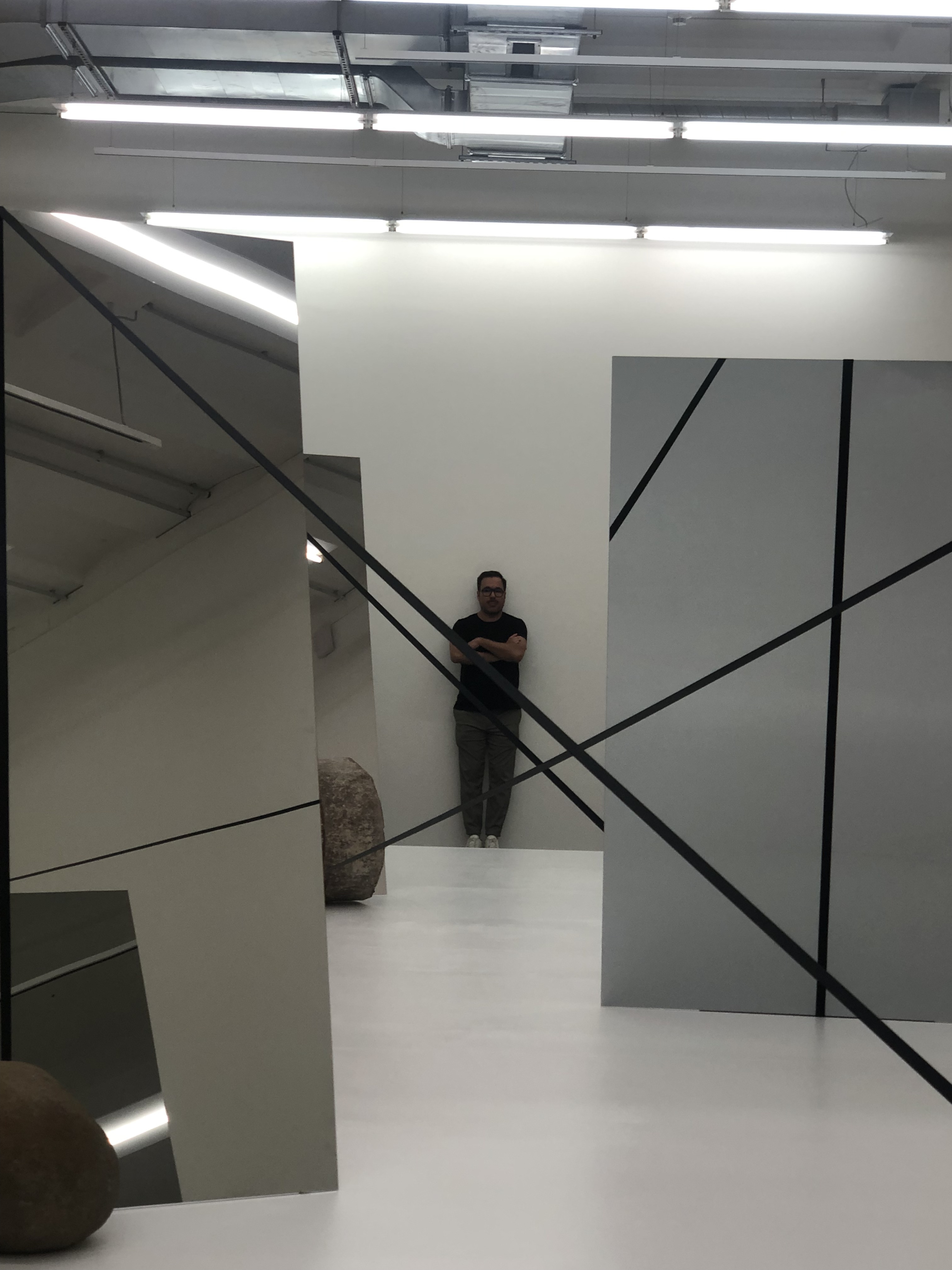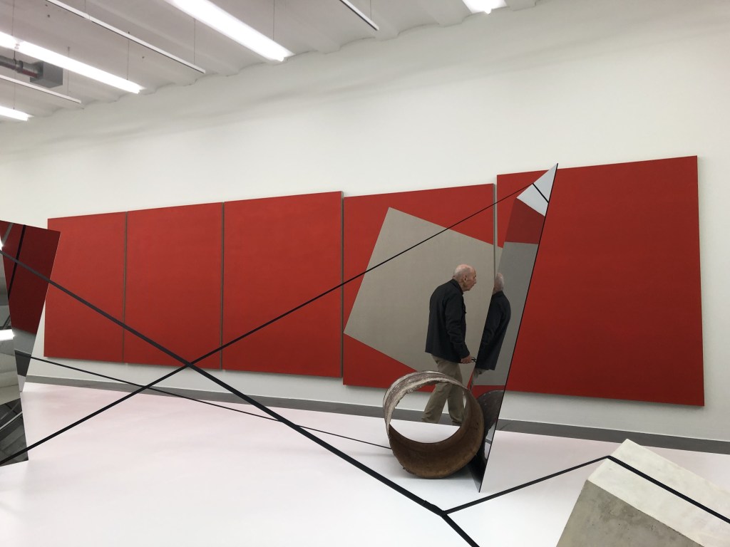 Damit werden Scheiben zu Licht-Bildflächen in der Diagonale gehalten (‹Shadows I und II›, 2022), Benzintonnen im Winkel an die Wand gespannt (‹The Rope Sometimes Bursts›, 2022) oder ein Stahlreifen an den Sockel geknebelt, und das lange Knebelende darf noch eine Arabeske auf dem Boden vollführen (‹The Act of Perseverance›, 2022). Überzeugender ist da die Arbeit ‹Will has moved mountains›, 2020. Das ist skulpturale Spanngurtequilibristik zum Staunen und im Zwischengeschoss gelungen mit der fünfteiligen Farbfeldmalerei ‹Memory of a Telluric Movement›, 2020, an der Stirnwand kombiniert. Auf einem Podest hält ein sicher fünfzig Meter langes schwarzes Band hintereinander vier leicht gekippte Spiegelwände. Band und Spiegel wiederum werden durch schwere Gegenstände, Steine, Kuben, Holzquader gerade so gehalten, dass sie uns nicht entgegenkippen können. Hier beginnt ein faszinierendes Spiel im Auge der Betrachtenden: Die Spiegel erweitern den Raum und entziehen ihn zugleich. Wir sehen uns, aber nichts ist dahinter, und wir halten uns an den Gurten, den Gegenständen, die sich nun magisch zu heben, senken und zu stürzen scheinen. Das ist an Dramatik kaum zu überbieten. Nichts wie hin!
