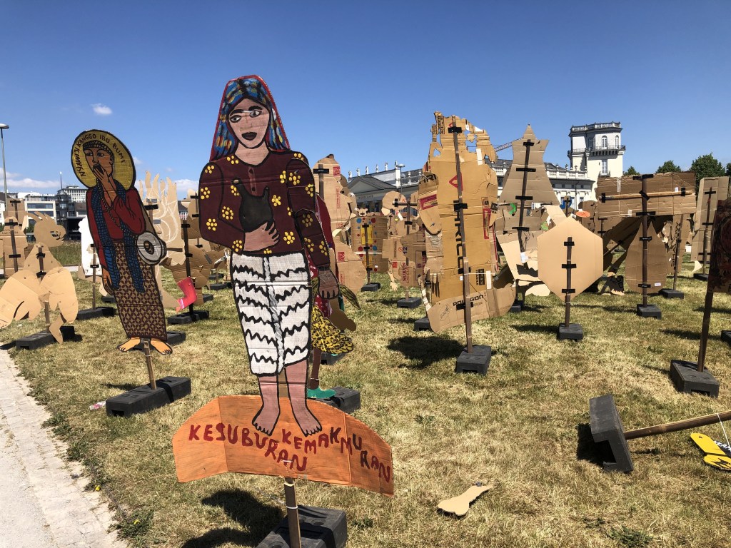 Der Ruf, die Kunst möge die gefallene Menschheit weiser machen, beglücken und erlösen, ist so alt wie ihr Begriff, der sich mit der Aufklärung im 18.-Jahrhundert formierte. Josef Beuys’ Schlagwort von der «Sozialen Plastik» ist ein schöner Nachhall darauf. So nimmt es nicht für Wunder, dass sich das indonesische Künstler-Aktivist*innen Kollektiv Taring Padi für das Tableau «People’s Justice» (2002) die Ikonologie eines christlichen Weltgerichts zu eigen macht. Antisemitische Stereotypen inklusive. In einem Haufen Schädel, beschriftet mit Stätten des Kriegs und Leids, fehlten Auschwitz, Sobibor, Treblinka. Der Banner aus der Post-Suharto-Diktatur wurde wie in den Feuilletons sattsam diskutiert, wenige Tage nach seiner Kassler Veröffentlichung am prominenten Friedrichsplatz verhüllt, dann abgebaut. Die hunderten karnevalesken Pappfiguren mit Tragestäben darum herum in den Boden gerammt, abgeräumt. Solche Figuren wurden in Demonstrationszügen in Yogyakarta 1998 als Ausdruck des Protests getragen. Taring Padi dachte an ein Reenactment: Die Kassler Bevölkerung sollte mit ihnen als bunte Masse social media-tauglich durch die Innenstadt marschieren. Daraus wird nun nichts.