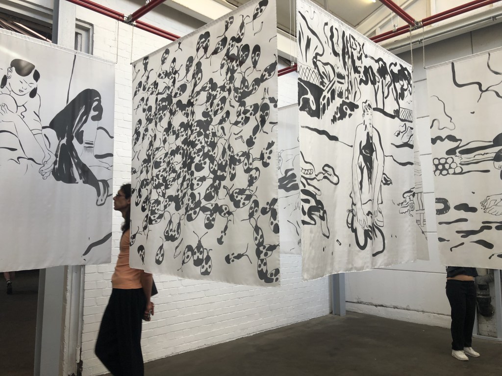 Licht flutet weich, freundlich von oben aus den Sheddachfenstern. Darunter hängen an roten Gestängen rechtwinklig weisse Seidentücher, auf denen der Berliner Künstler Nino Bulling mit betörend sicherem Pinselstrich eine schnell gezeichnete Serie von Szenen der Zweisamkeit zwischen intimer Nähe und Distanz, Selbstfindung und Verlorenheit geschaffen hat. Traumwandelnd gelingt ihm ein Raum zwischen Ruhe und vibrierender Spannung, die uns in unserem Selbstverständnis verunsichert, definitiv der oder jene zu sein. Nino Bulling 1987 in Berlin als Mädchen geboren, in Halle ausgebildet, Comiczeichner und Autor kennt diese Verunsicherung aus eigener Erfahrung und bringt sie hier in Bilder, die wir von Stoffbahn zu Stoffbahn in Narrative übersetzen.