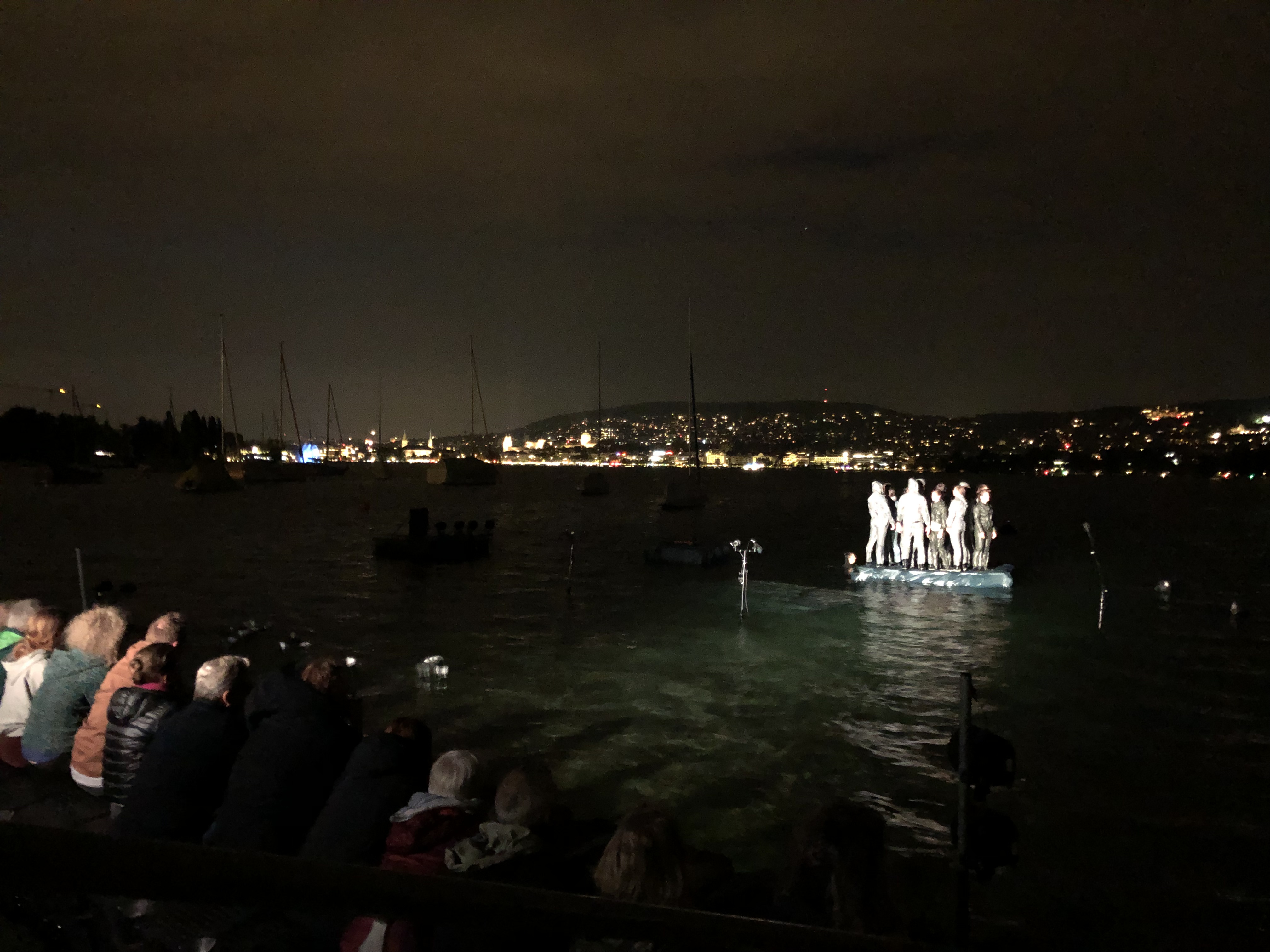 Die Kulisse ist atemberaubend. Im Sonnenuntergang glänzt die Altstadt Zürichs und verdoppelt sich in den dunklen See, wie die eng und teuer bebauten Ufer nach Osten, wo unter schwarzen Gewitterwolken die Alpenriesen grüßen. Es ist kurz nach acht Uhr. Wir befinden uns Anfang September am Ufer der kleinen, durch einen Steg mit der sogenannten „Landi“-Wiese verbundenen Stäfa-Insel am Zürichsee. Alljährlich findet auf dem Areal in eigens dafür erstellten Bühnen und Lokalen das Theater-Spektakel statt.